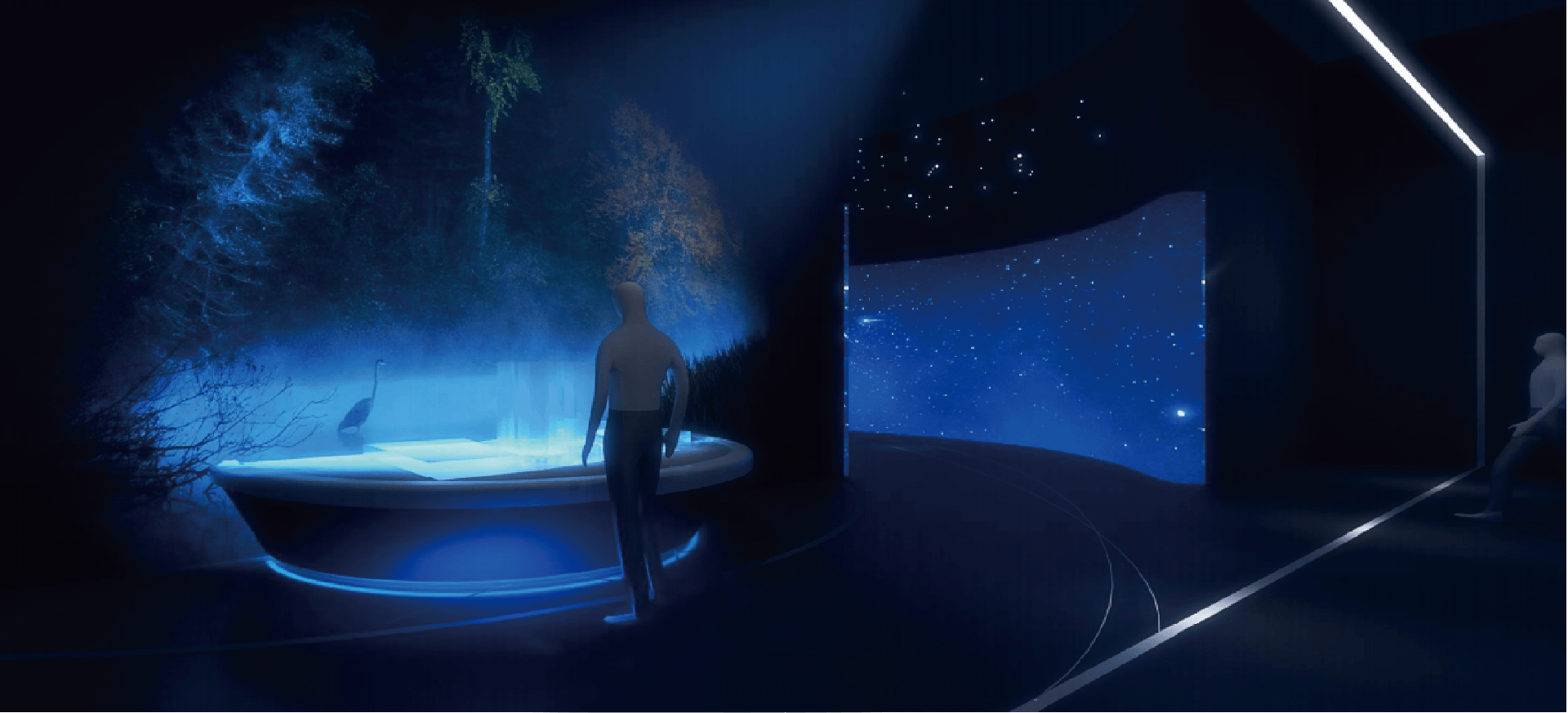 我們展廳設(shè)計(jì)團(tuán)隊(duì)利用“元 —— 生命之源、生命力、生生不息、復(fù)元”的傳統(tǒng)哲學(xué)思想,作為運(yùn)思的背景、語感的依據(jù)。主打“海洋、地球、星空”三種意象,打造一個劇場前進(jìn)式的沉浸式體驗(yàn)館,并設(shè)置了三道門和五幕劇來豐富體驗(yàn)館的敘述結(jié)構(gòu),旨在為來訪者全身心感受干細(xì)胞的生命魔力。