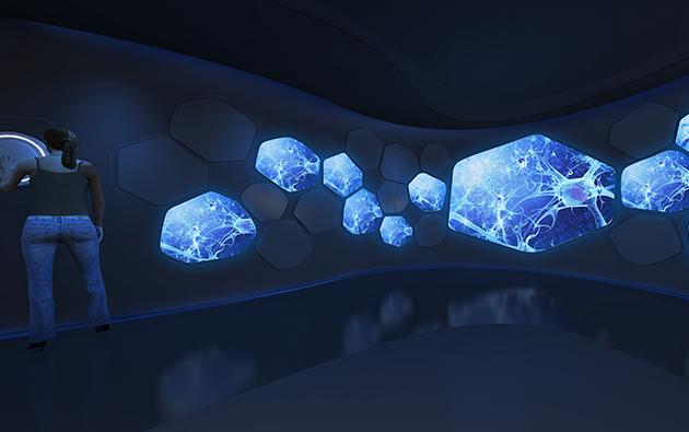 茵冠生命未來(lái)館基于為廣大市民服務(wù)的設(shè)計(jì)原點(diǎn),擬將深?yuàn)W、復(fù)雜的生命科學(xué)進(jìn)行簡(jiǎn)約化展陳設(shè)計(jì),整廳一共劃分為五個(gè)板塊,分別是“科普、細(xì)胞儲(chǔ)存、基因檢測(cè)、疾病治療、健康管理”。深圳未來(lái)印象展廳設(shè)計(jì)團(tuán)隊(duì)遵循國(guó)際化設(shè)計(jì)規(guī)范,運(yùn)用醫(yī)療白作為氛圍基調(diào),巧用了科技藍(lán)進(jìn)行屬性渲染,傾力打造一艘具有前瞻性的未來(lái)生命科學(xué)巨艦??茖W(xué)的演繹在于微觀技術(shù)的解構(gòu)展示和流程說(shuō)明,未來(lái)印象多媒體設(shè)計(jì)團(tuán)隊(duì)通過(guò)深入了解生命科學(xué)的奧秘,綜合利用聲光電多媒體技術(shù),精心設(shè)計(jì)了一系列多媒體展項(xiàng)對(duì)生命科學(xué)的探索和細(xì)胞科學(xué)的技術(shù)進(jìn)行精彩的演繹。